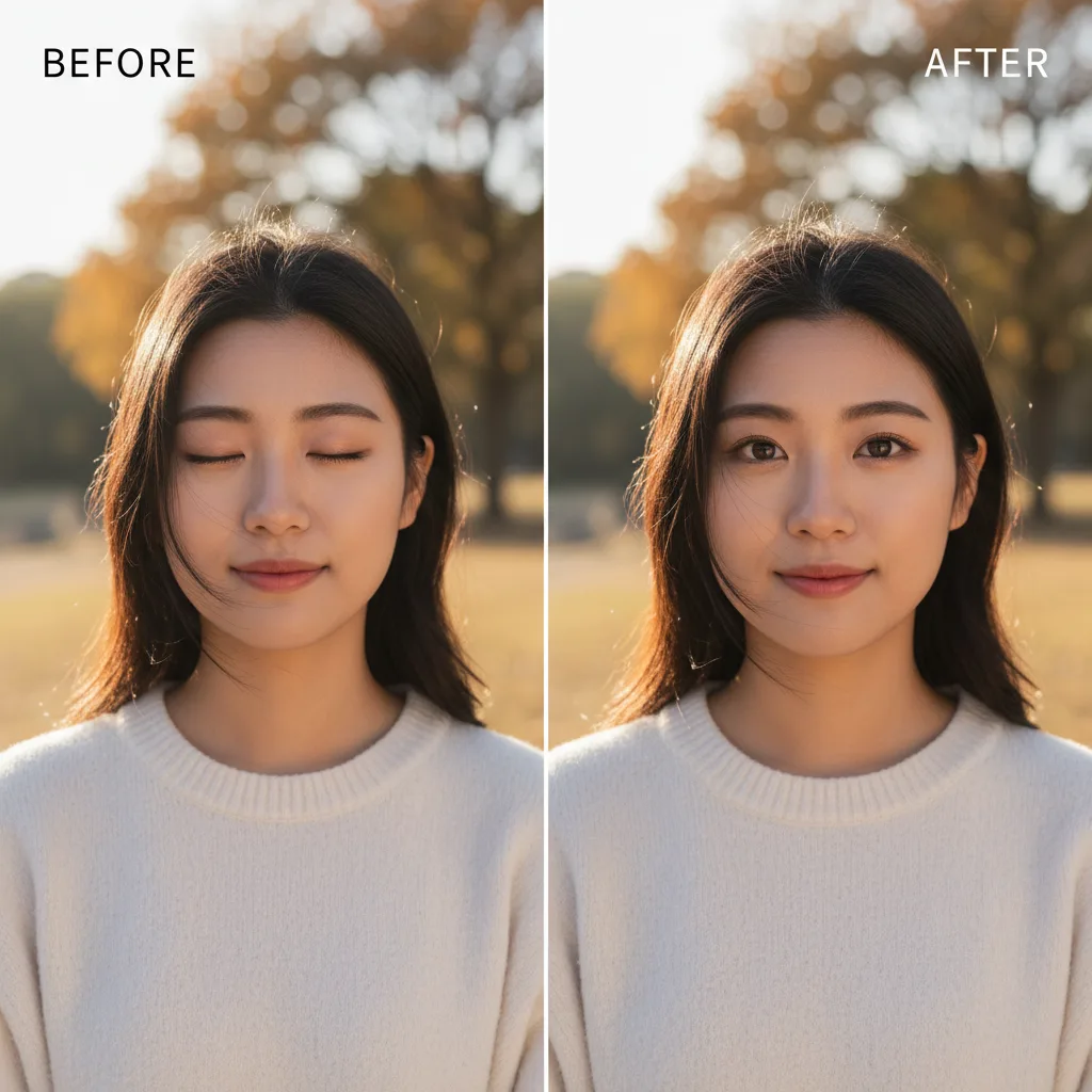 Someone blinked at the worst moment? Open eye AI opens closed eyes while preserving the person's natural eye shape, color, and facial expression. Works on selfies, group photos, and portraits.